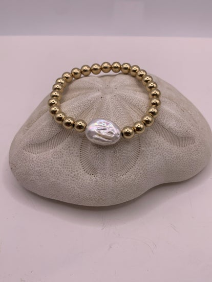 A 6A grade Keshi pearl sits at the center of this elegant stretch bracelet, surrounded by polished 6mm gold-filled beads. Wear alone or add to your stack