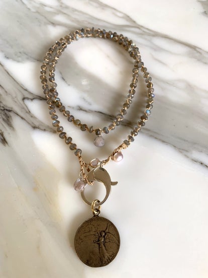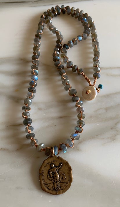 Faceted rounds of labradorite are handwoven in silk thread, creating a mesmerizing, luminous design. The piece is accented with a reproduction French bronze pendant, adding a vintage touch, and finished with a pearl button clasp.