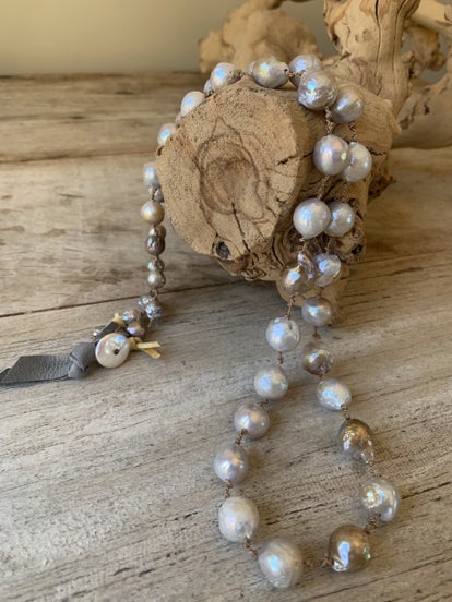 Luminous, silvery, wrinkly, Edison pearls hand-knotted on silk thread with a leather and pearl clasp.