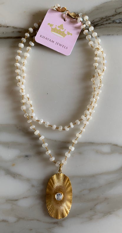 Faceted rounds of moonstone are wire-wrapped in gold wire, creating a luminous 36-inch necklace. At the center, a gold vermeil sunburst pendant features a glowing moonstone, adding a touch of celestial beauty.