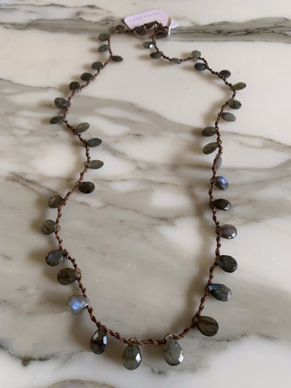 This piece is made with faceted rounds of labradorite which are hand-woven in soft silk thread. At center is a vermei land labradorite sunburst pendant. Wear long or doubled.