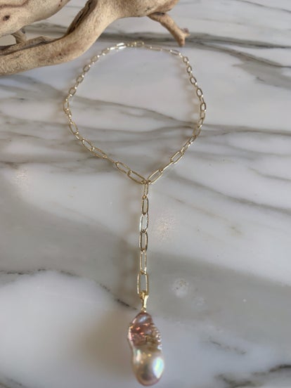 This handcrafted piece features a gold-plated paper clip chain, a Y-drop silhouette, adjustable length, and lustrous freshwater baroque pearl pendant.