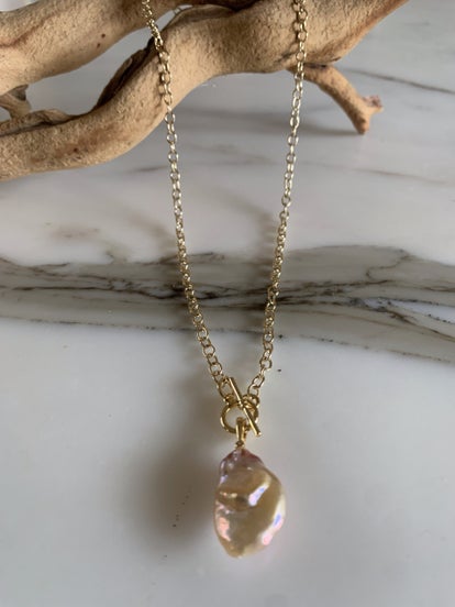 A stunning champagne pink Keshi pearl pendant dangles from a sleek toggle clasp, suspended on a gold vermeil cable chain. The lustrous pearl and rich gold vermeil combine to create a timeless and elegant piece.