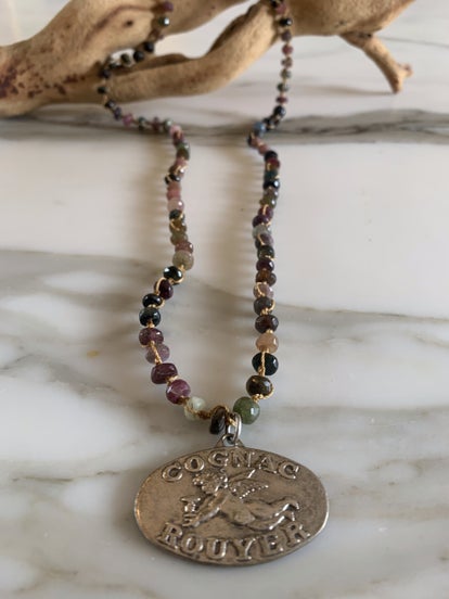 Deep tones of multicolored tourmaline gemstones, meticulously handwoven onto silk thread. Measuring 36 inches in length, it offers versatility, allowing it to be worn long or doubled with a vintage silver cognac pendant, from Paris, France.